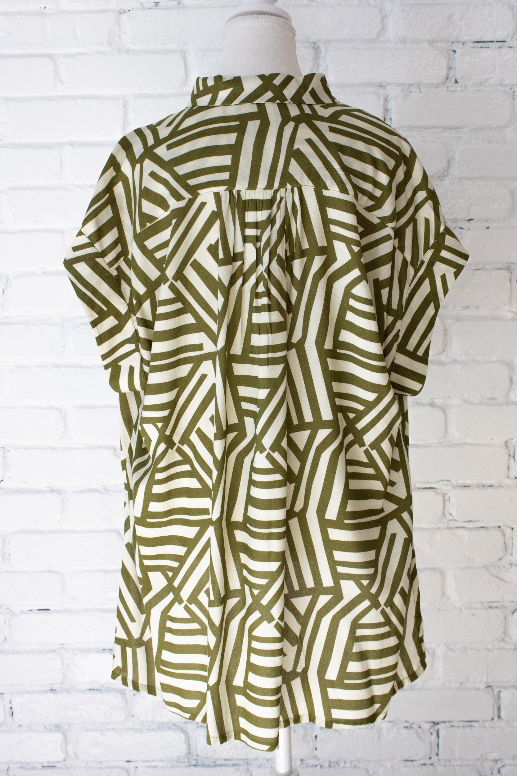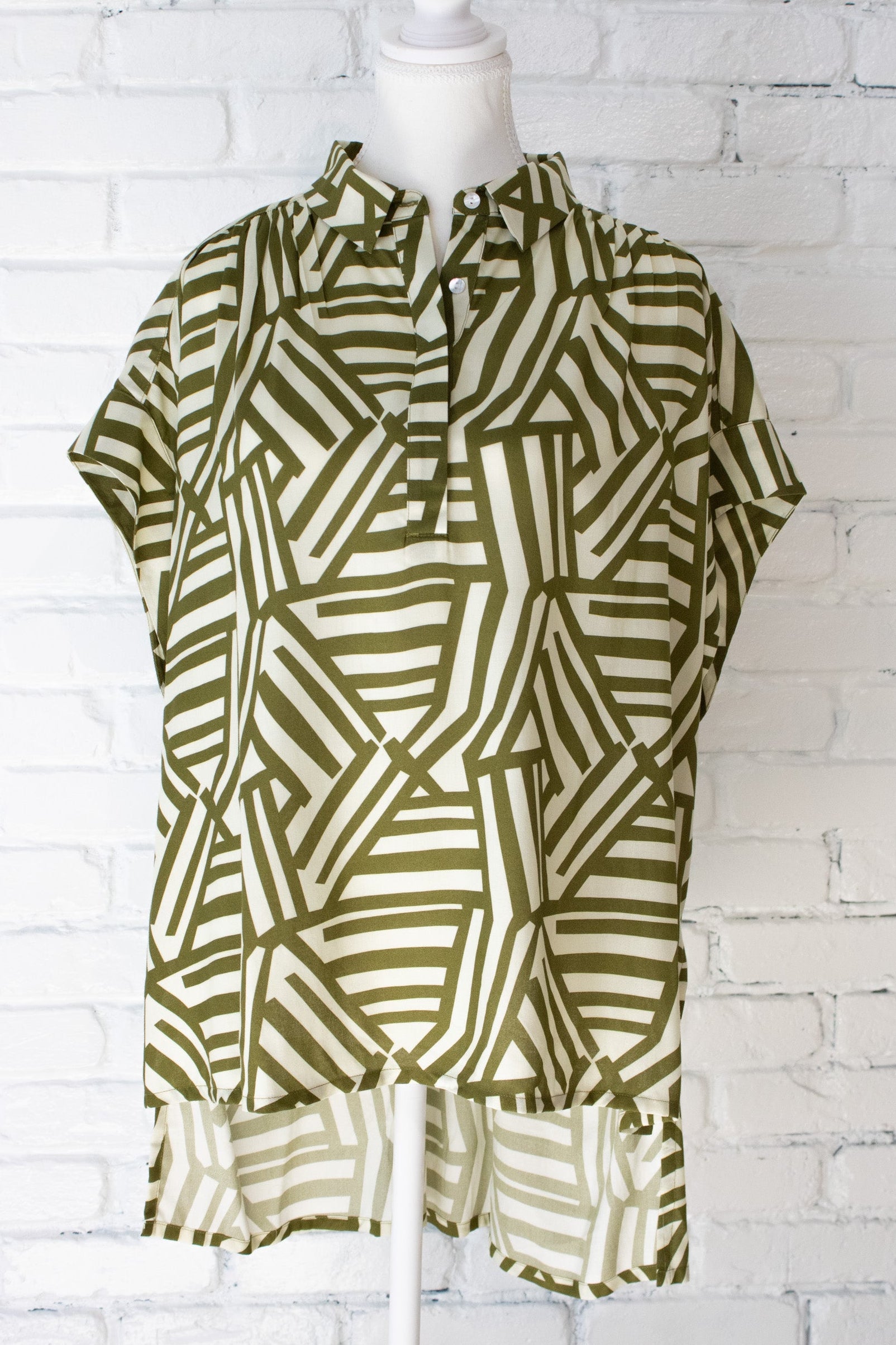 The structured collar and half-button placket create a flattering open V-neckline, while the buttons are neatly hidden under a tailored placket for a clean, elevated finish. The wide cap sleeves give you relaxed coverage with an easy feminine and flattering drape.