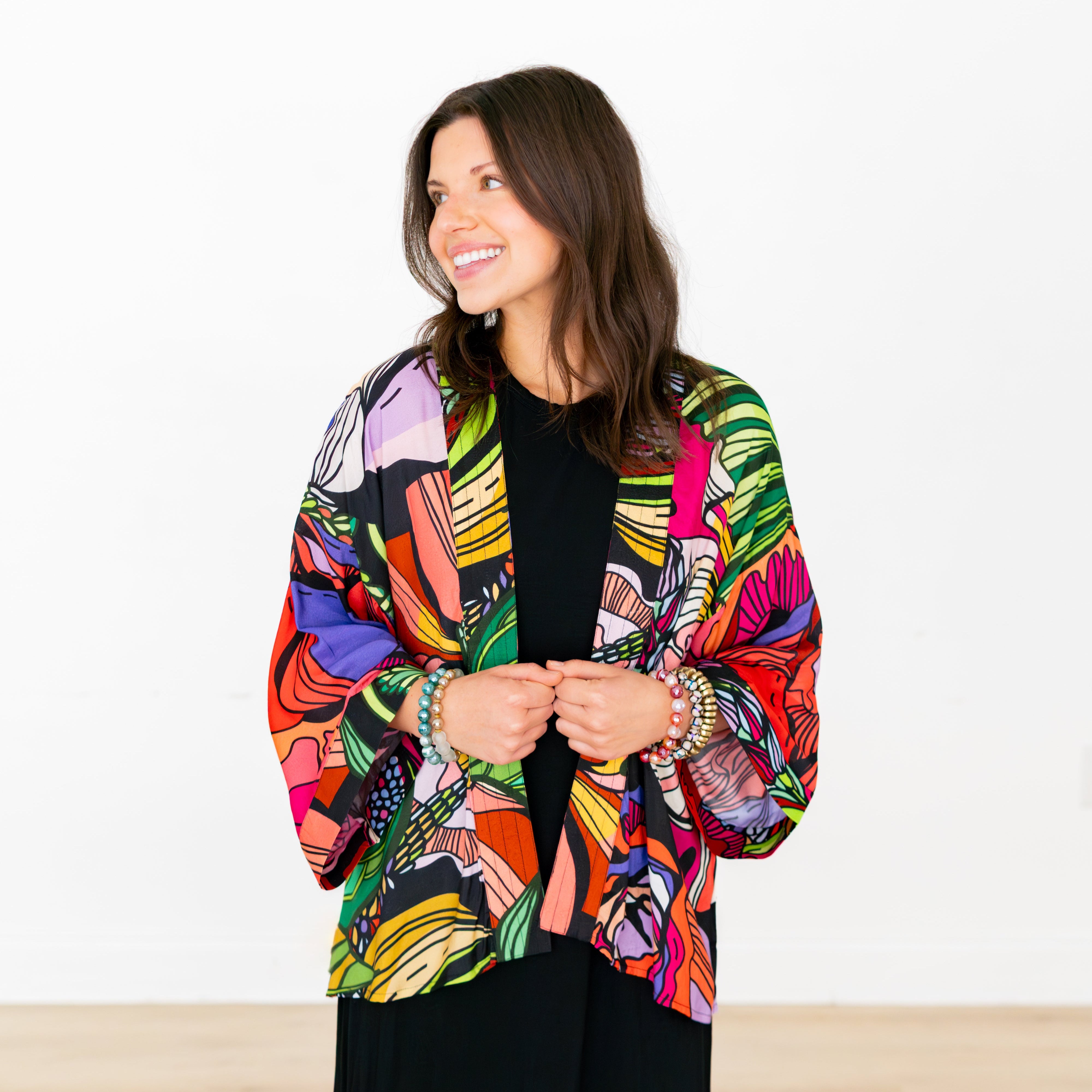 Whether you're running errands, meeting friends for lunch, or attending a special event, our short kimono adds a touch of elegance to any outfit. Elevate your wardrobe with this stylish essential that transitions seamlessly from day to night.