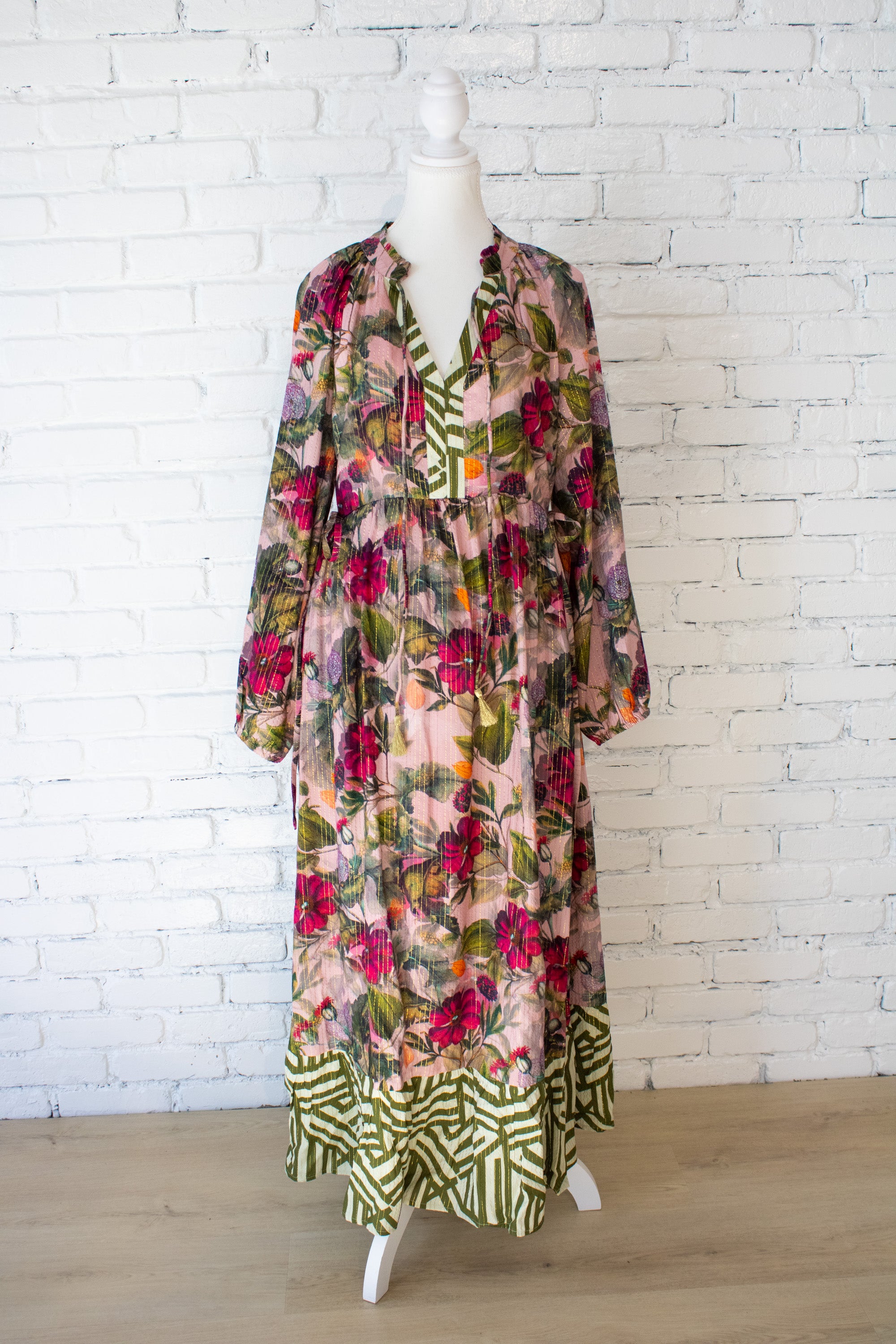 Made from our luxe lurex fabric featuring delicate gold threads woven vertically through the print, this dress has a soft shimmer that moves beautifully in the light.